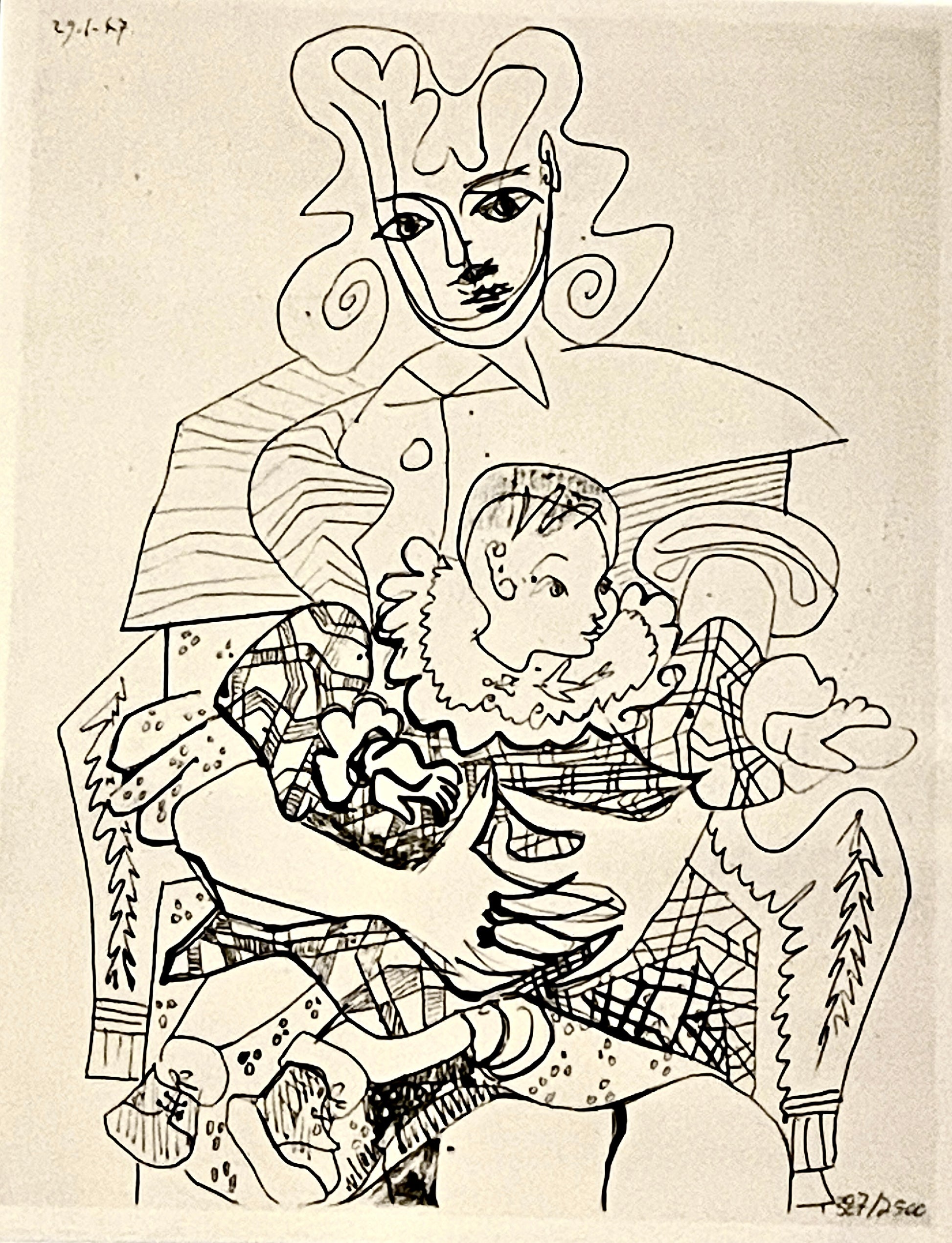 The use of lithography as a medium allowed Picasso to experiment with texture and contrast in new ways. His prints from this time display a sophisticated handling of the lithographic process, balancing areas of dense black with subtle grays and whites to create a sense of depth and dimension. Picasso’s lithographs from this period are also notable for their expressive spontaneity; they often look like sketches, yet they are meticulously composed, showing the artist’s ability to convey complex ideas with apparent simplicity.