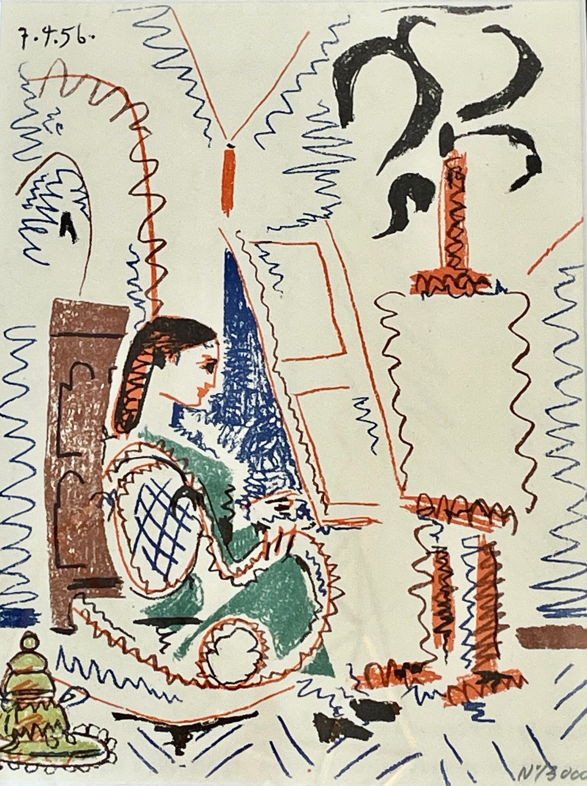 The use of lithography as a medium allowed Picasso to experiment with texture and contrast in new ways. His prints from this time display a sophisticated handling of the lithographic process, balancing areas of dense black with subtle grays and whites to create a sense of depth and dimension. Picasso’s lithographs from this period are also notable for their expressive spontaneity; they often look like sketches, yet they are meticulously composed, showing the artist’s ability to convey complex ideas with apparent simplicity.