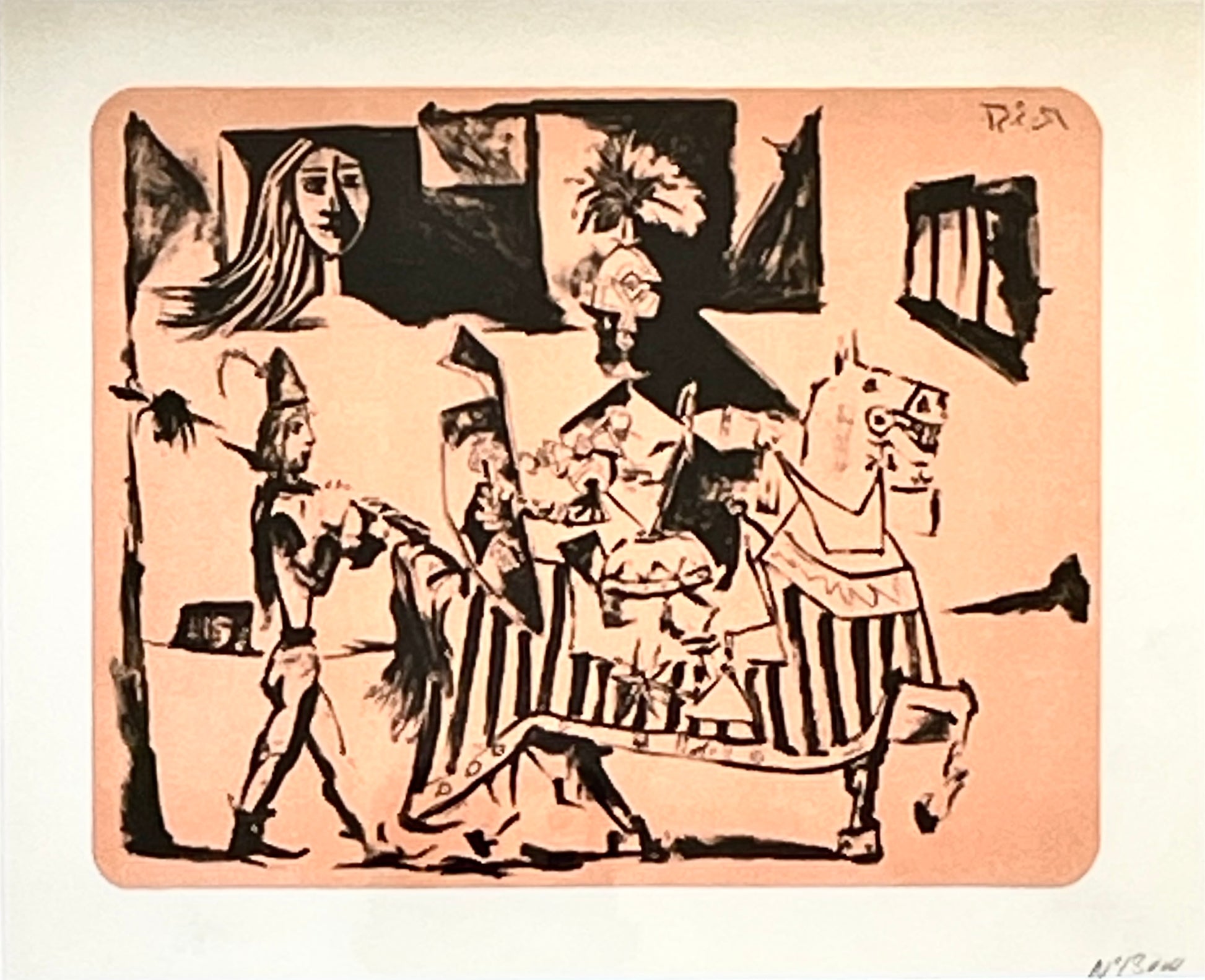 The use of lithography as a medium allowed Picasso to experiment with texture and contrast in new ways. His prints from this time display a sophisticated handling of the lithographic process, balancing areas of dense black with subtle grays and whites to create a sense of depth and dimension. Picasso’s lithographs from this period are also notable for their expressive spontaneity; they often look like sketches, yet they are meticulously composed, showing the artist’s ability to convey complex ideas with apparent simplicity.